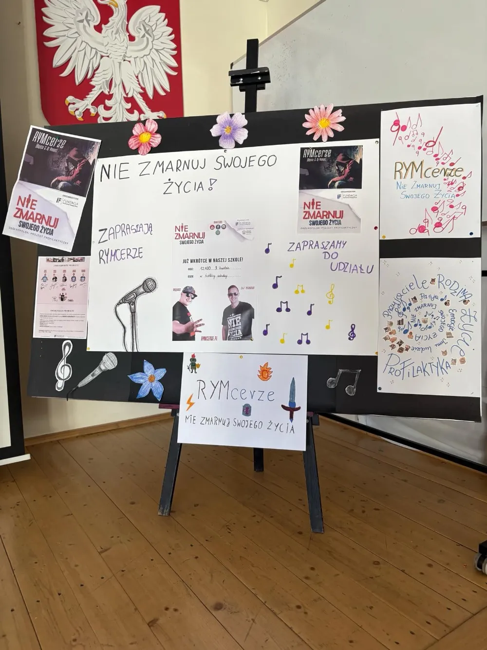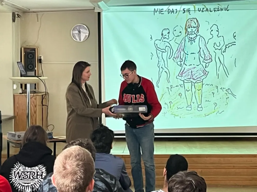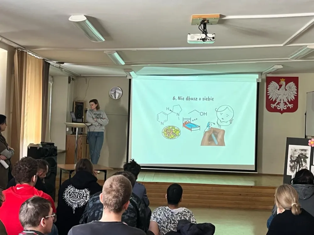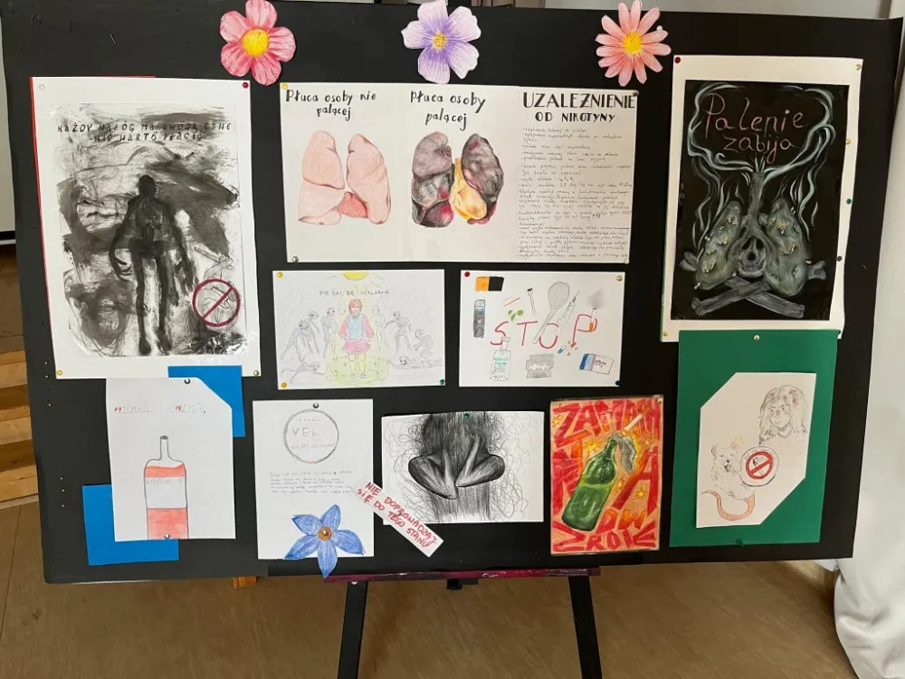 We współpracy z panią Ewą Olesiejuk został zaprezentowany pokaz slajdów dotyczący szkodliwości używek, takich jak palenie papierosów oraz spożywanie alkoholu. Celem prezentacji było zwiększenie świadomości uczniów na temat zagrożeń płynących z uzależnień.