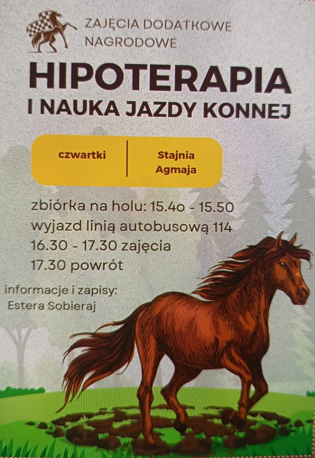 Hipoterapia i jazda konna to wyjątkowe formy aktywności, które łączą ruch, kontakt z naturą i bliskość zwierzęcia. W naszej placówce od lat popularne i lubiane... zaś Stajnia Agmaja ma niesamowity klimat angielskiej wsi. Hipoterapia wspiera rozwój psychoruchowy poprawia równowagę, koordynację i napięcie mięśniowe, a także działa terapeutycznie na emocje i relacje społeczne Z kolei jazda konna rozwija sprawność fizyczną, koncentrację, odpowiedzialność i pewność siebie. Kontakt z koniem daje poczucie spokoju i harmonii, a przebywanie na świeżym powietrzu sprzyja zdrowiu i dobremu samopoczuciu. Pomaga też w przełamywaniu lęku - bo jak sie okazuje... "koń nie taki straszny jak się wydaje" Zachęcamy do zapisów! Informacje u p. Estera Sobieraj.